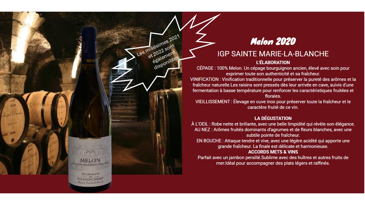 CÉPAGE : 100% Melon. Ce cépage historique offre une fraîcheur unique et une palette aromatique délicate.